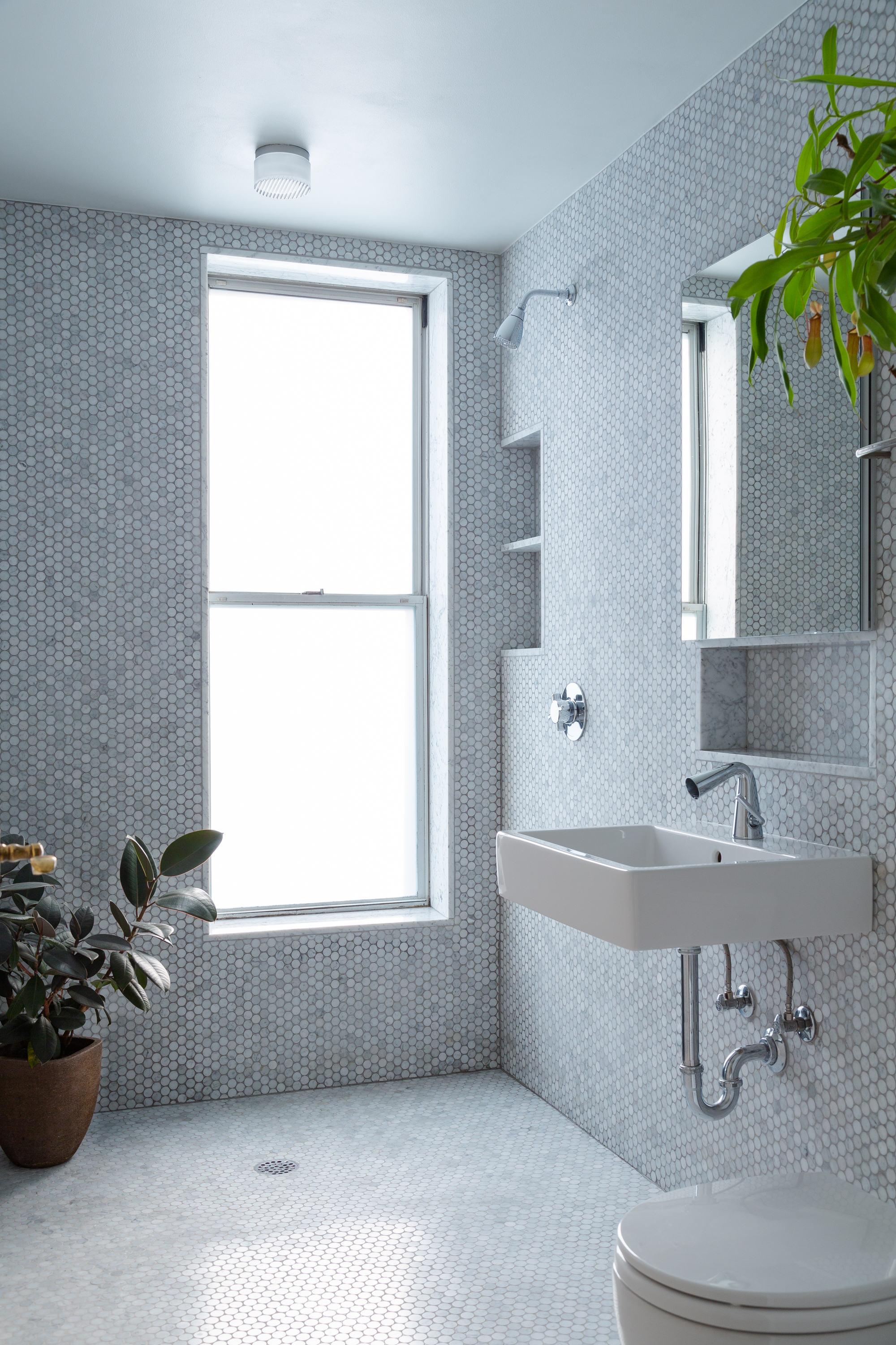 The parlor floor is the focus of the transformation, with the goal to create a relaxed, open space for cooking, dining, and gathering. The floor had been reconfigured several times over the building’s life: a small brick, steel & glass-block extension was added in the 1940s, and a bathroom was inserted in the center of the floor plate in the 1970s, severing the traditional pocketed-door connection between front and rear rooms.